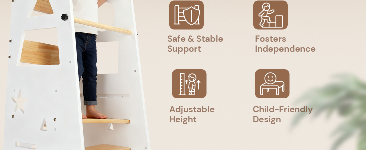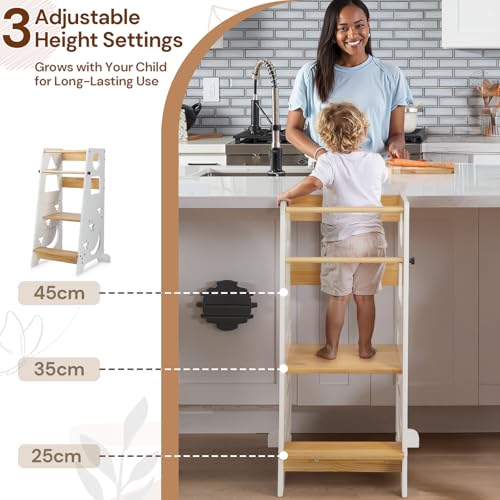 - [3-Level Adjustable Learning Tower]: This three-level adjustable kitchen standing tower is designed for children of different heights. With a maximum load capacity of 60 kg, it is suitable for children from 1.5 years and up, growing with your child as a long-term family investment.