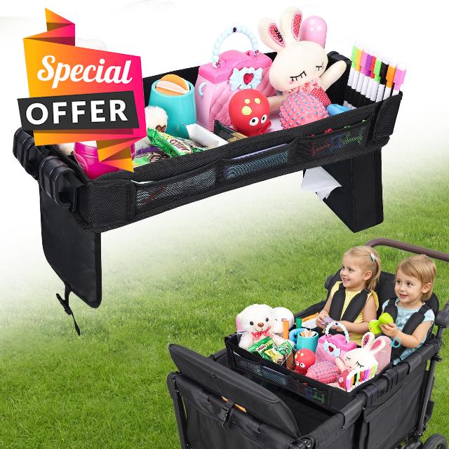 - All-in-One Organized Storage: The double sided stroller tray is designed for practical functionality. Both sides feature marker storage, accommodating up to 18 markers for organized and convenient access. 4 mesh pockets for small items. Wagon parent console snack tray has 1 tissue compartment and 2 cup holdersand an extra large mesh pocket. All items can be neatly organized and stored, so you can say goodbye to the hassle of misplaced belongings.