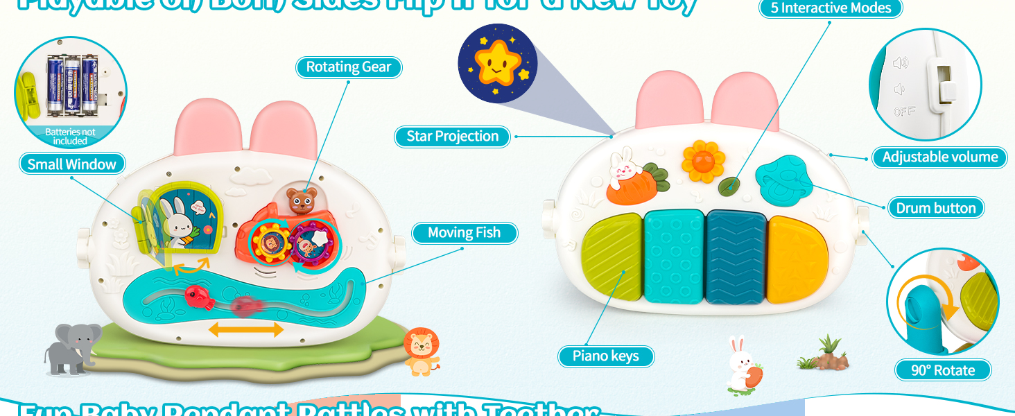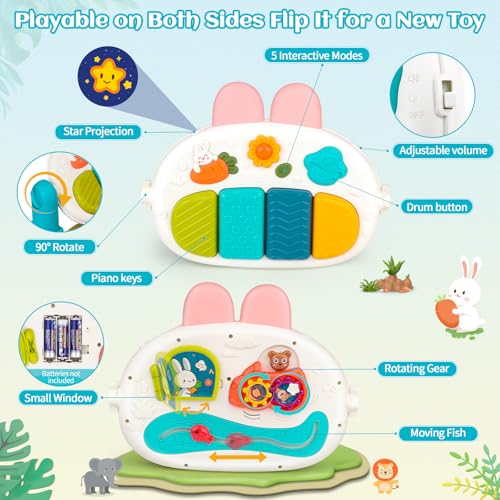 - 【Upgraded Piano with Adjustable Volume】Use this baby piano to stimulate sensory fun! The foot-controlled piano keys have soft lights and a star projection light. It can rotate 90°, and has 5 modes: Music/Scales/Animals/Sounds/Whack-A-Mole and 2 volume levels. It can be played from both sides. It is the perfect sensory toy for babies 0-6 months and 6-12 months old