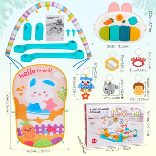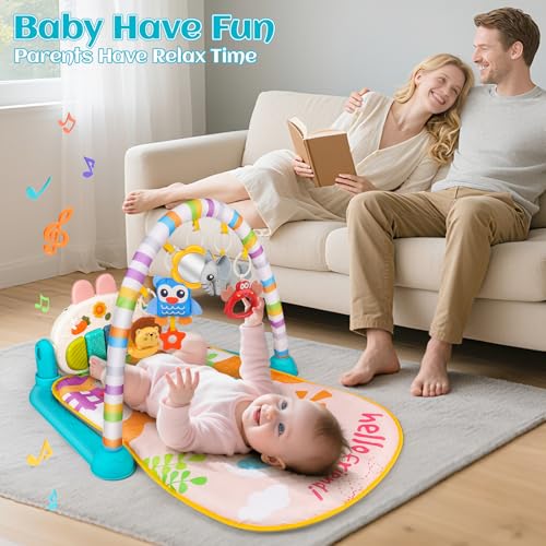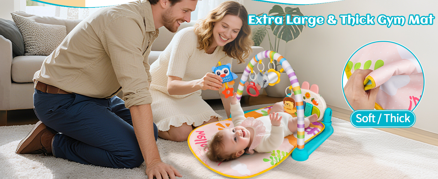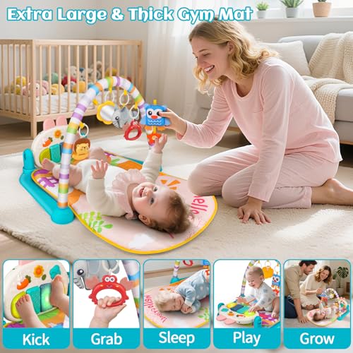 - 【5-Mode Gym + Thick Mat】This Baby Play Mat features Kick, Grab, Sleep, Play, and Grow modes with 5 detachable hanging toys & a musical piano. The newly upgraded thick mat delivers cushioned comfort during playtime, tummy time, or rest