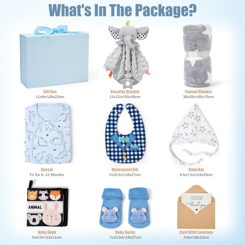 - Thoughtful Newborn Baby Gifts Set – Perfect for Baby Showers. This complete newborn baby gifts set includes a soft flannel blanket, cosy security blanket, adorable onesie, waterproof bib, baby socks, baby hat, a charming baby book, and a card with envelope, all beautifully presented in a luxury gift box. Ideal as baby shower gifts, these new born baby essentials are suitable for both baby boys and girls, making it a wonderful surprise for new parents.
