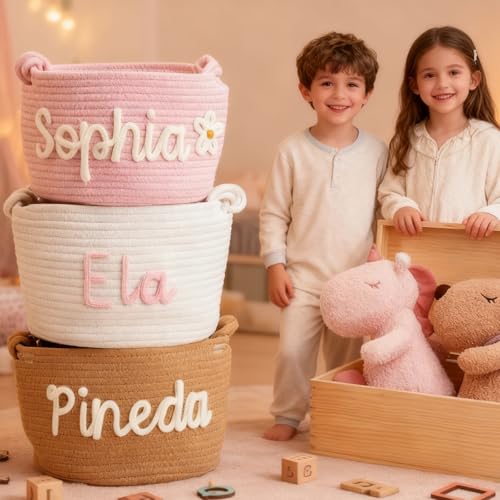 - Personalised Storage Baskets: Each storage basket features hand-embroidered names on the front with handmade flower accents, making every basket a unique gift or home decor piece.
