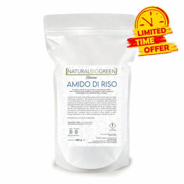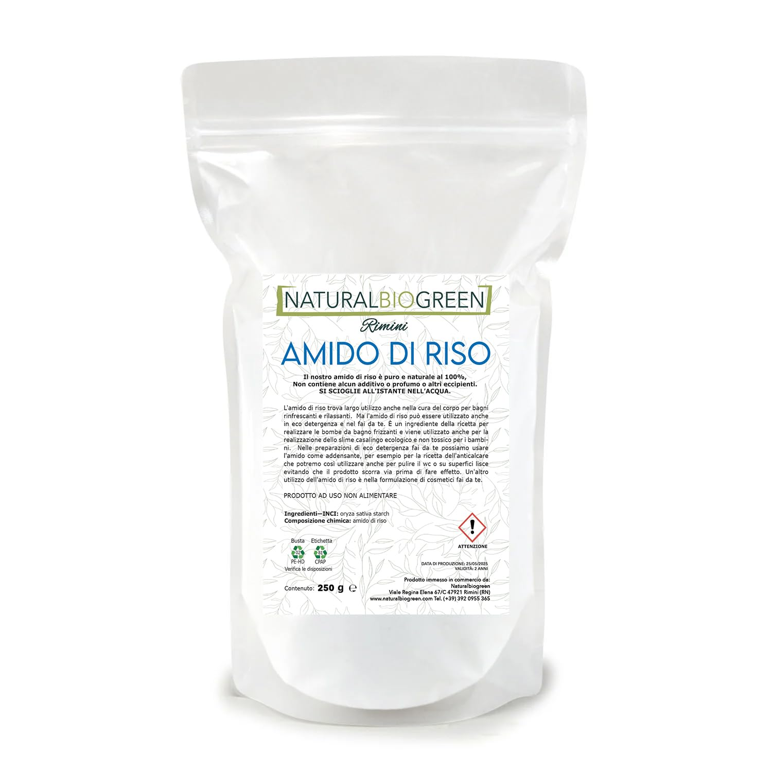 Naturalbiogreen 100% Pure and Natural Rice Starch 250 g bag Rice starch is also widely used in body care for refreshing and relaxing baths. But rice starch can also be used in eco cleaning and DIY. It is an ingredient in the recipe for making sparkling bath bombs and is also used for making homemade slime that is environmentally friendly and non-toxic for children. In DIY eco cleaning preparations, we can use starch as a thickener, for example for the anti-limescale recipe, which we can also use to clean the toilet or on smooth surfaces preventing the product from flowing away before it takes effect. Another use of rice starch is in the formulation of DIY cosmetics. Our rice starch is 100% pure and natural, contains no additives or fragrances or other excipients. Product for non-food use. Instantly shakes in water.