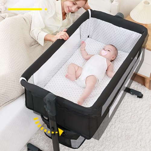 3-in-1 Baby Bedside Crib, Adjustable Baby Bassinet, Portable Travel Cot High Carbon Steel Frame, Breathable Mesh Sides, Lockable Wheels, Foldable Travel Cot with Mattress for Newborns