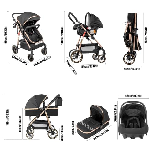 3 in 1 Baby Travel System(Newborn to 3 Years Baby Pushchair)–High-View Pram,Reversible Seat,One-Hand Fold(Black&Gold)