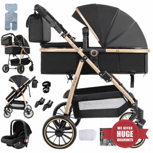 3 in 1 Baby Travel System(Newborn to 3 Years Baby Pushchair)–High-View Pram,Reversible Seat,One-Hand Fold(Black&Gold)
