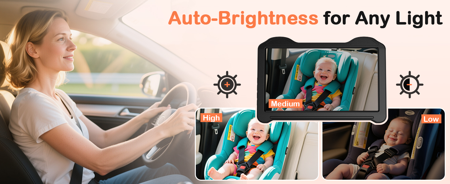 - Auto Brightness Adjustment – Travel with Ease: The car seat camera can be adjusted to fit most car models and seat sizes. This baby car camera with 150° wide angle view lets you monitor your babies from the backseat one at a time! The monitor has an auto-dimming sensor that automatically adjusts the brightness according to the car environment, eliminating the need for manual adjustments. The camera supports both mirror and normal image modes, easily switchable based on your child’s position