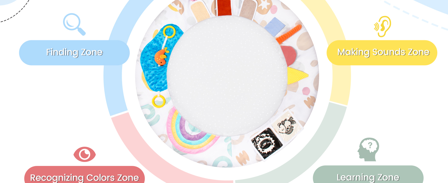 - Eye-Catching Design: The baby activity mat features an engaging, modern disc design with a rainbow pattern that encourages concentration, sound imitation, exploration of colors and textures, and peek-a-boo play