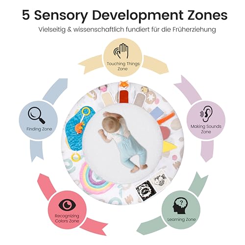 - 5-Piece Sensory Set: This large baby play mat includes 5 detachable sensory toys: 1 Montessori-style cloth book, 1 rattle, 1 play mirror, 1 crinkle toy, and 1 grasping trainer. Ideal for promoting motor skills and sensory development in newborns and infants (0-36 months)