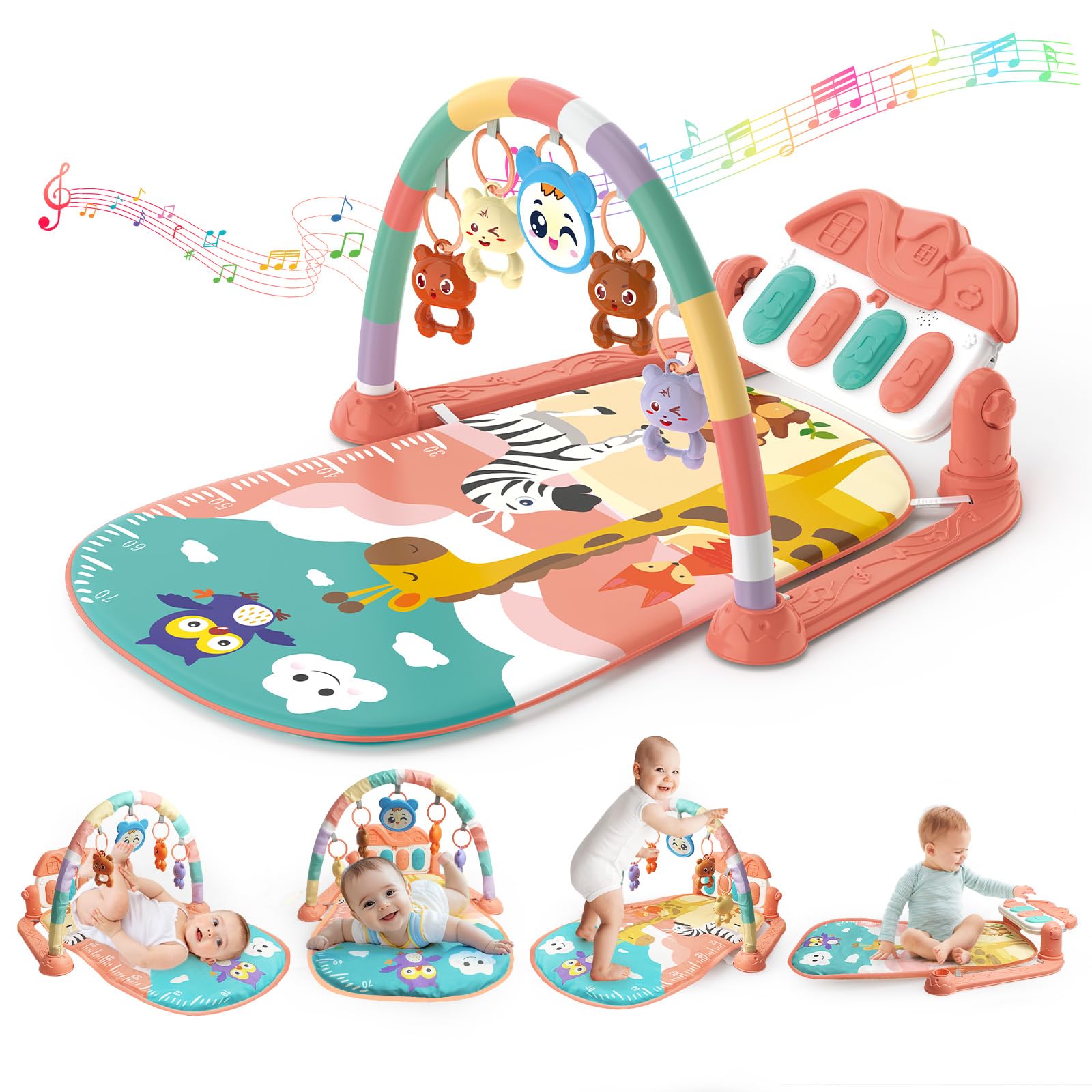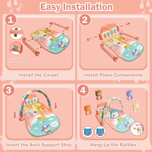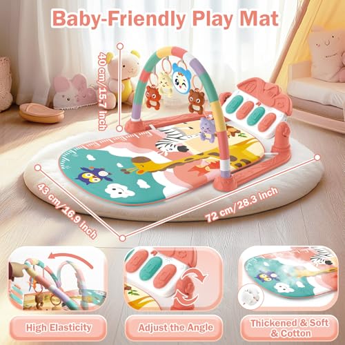 Baby Play Gym Mat 0-6 Months, Baby Activity Mat with Detachable Piano Panel and Hanging Rattles Toy, Sensory Kick and Play Piano Playmat for Babies 0-12 Months (Pink)