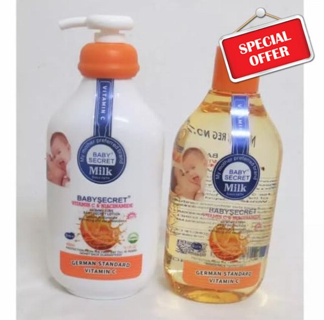 Baby Secret Vitamin C & Niacinamide Body Lotion 400ml + Oil 440ml – From Birth (2Pcs Set)
