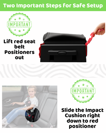 - 3-STEP EASY SETUP – 1) Push button to extend seat, 2) Raise red belt guides and secure, 3) Attach the abdominal shield low on buckle end of the vehicle seat belt.