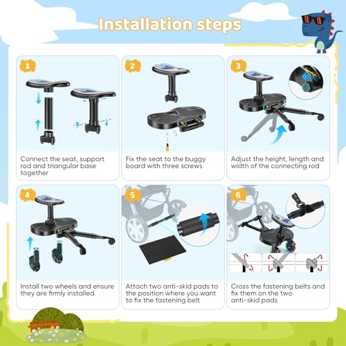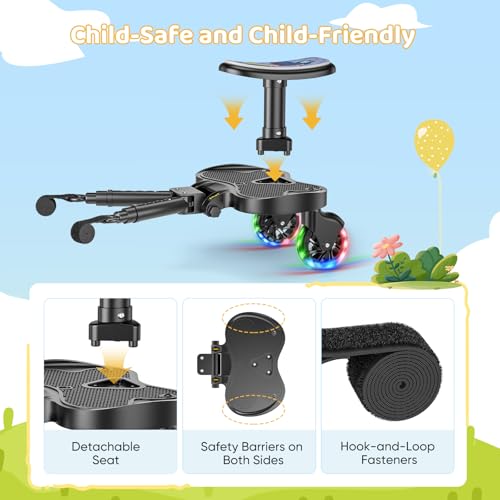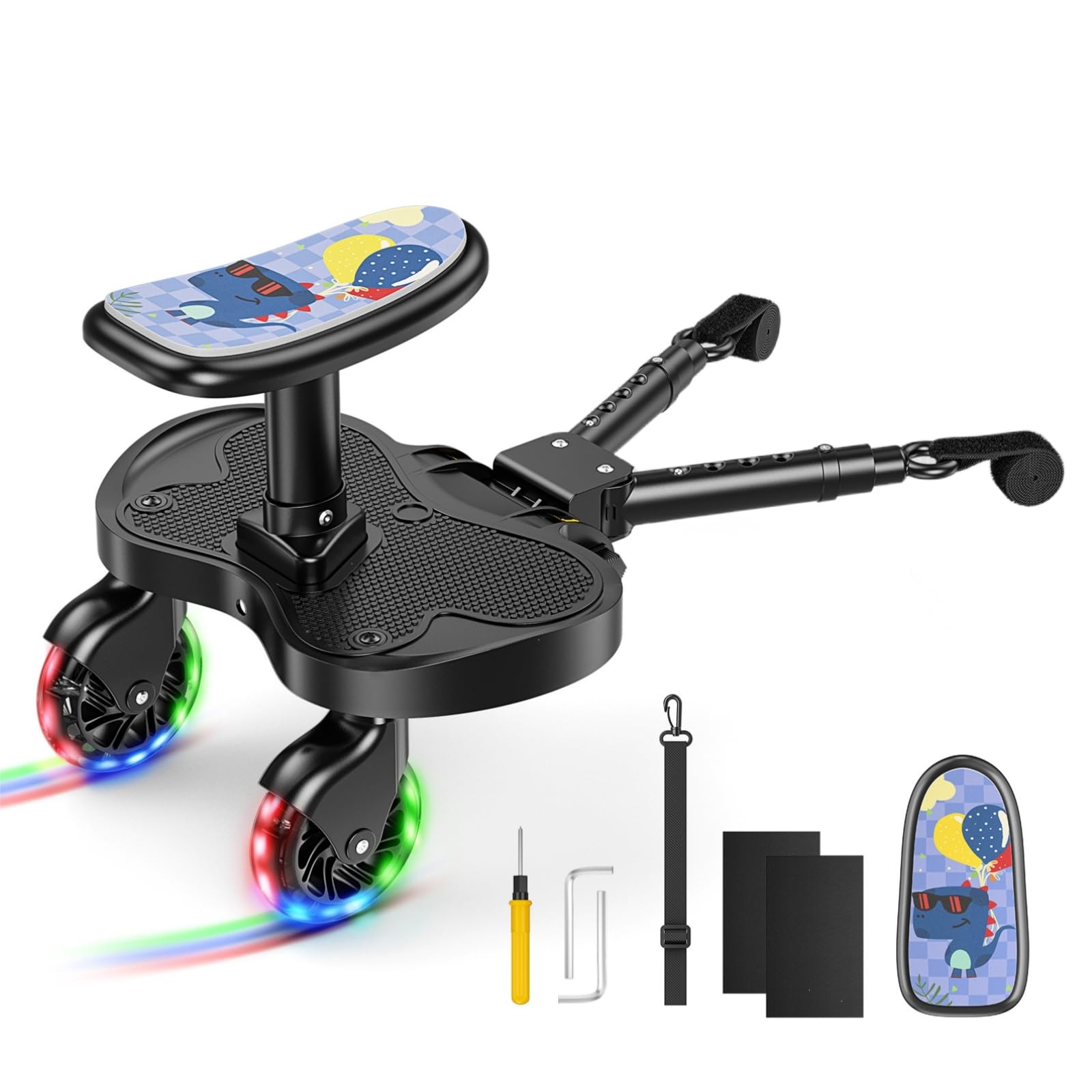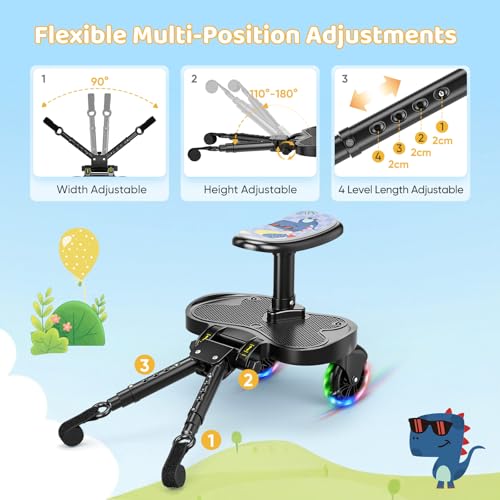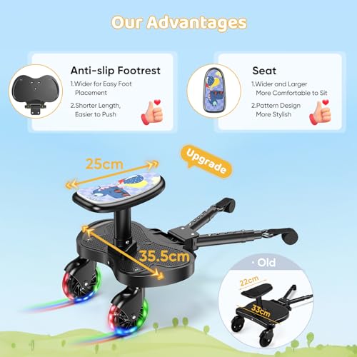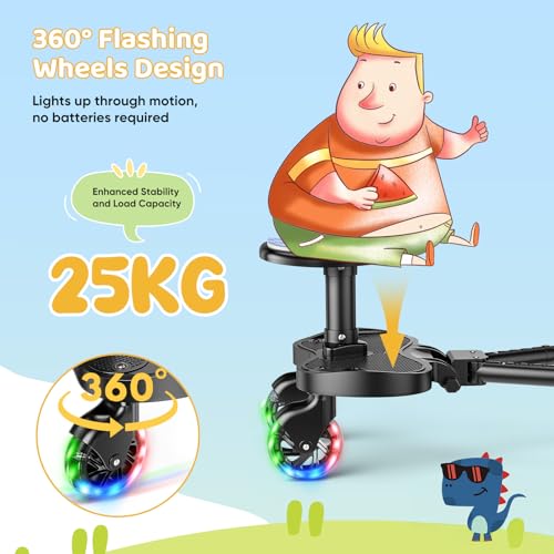 - 【Fun and Safety Combined】The buggy board is equipped with 2 LED flashing wheels (battery-free), which light up when rolled, enhancing nighttime visibility and ensuring safer travel. The seat cushion features a cute dinosaur design, adding a touch of fun to the journey. This Buggy Board features an extended seat design (25cm long, 13cm wide). The footrest area is lengthened, with raised anti-slip edges on both sides, providing children with a more comfortable and stable foothold
