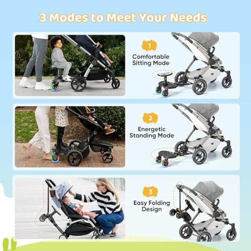 - 【Wide Applicability】The universal buggy board with seat is made from high-quality eco-friendly PP material, capable of supporting up to 25 kg (55 lbs), suitable for most children aged 2 to 6 years. The seat of kiddy board is removable, allowing the children to freely switch between sitting and standing modes, doubling the fun of outings