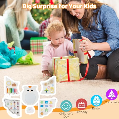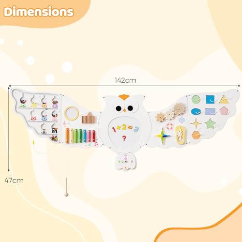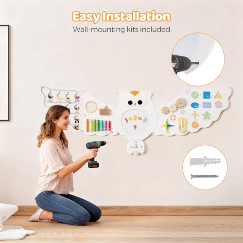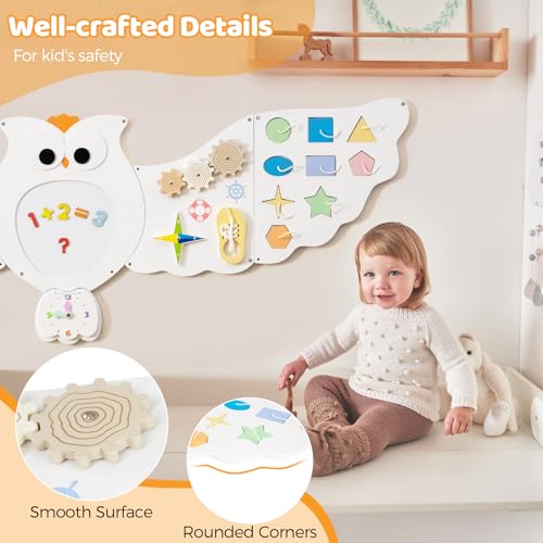 - 【Endless Fun with 11 Activities】The owl activity wall features 11 rotating, sliding, and sound-producing STEM activities. Shape matching, color sorting games, spinning gears, shoelace practice tools, compasses, xylophones, and other game panels keep little hands busy. While children enjoy free exploration time, parents gain more leisure time for themselves.