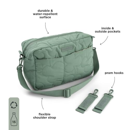 Sustainable, water-repellent finish. Adjustable shoulder strap and pram hook. Four inner and two outer pockets. Made from 15 recycled PET bottles