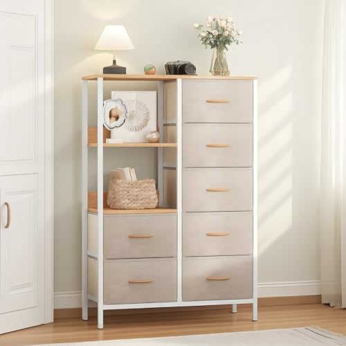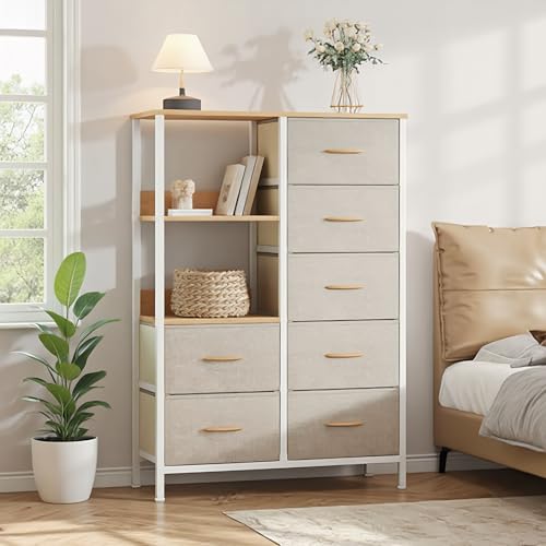 Feonase Chest of Drawers Bedroom, Fabric Dresser with 7 Drawers, Storage Dresser with 2 Open Shelves, Tall Storage Organizer Unit with Steel Frame, for Bedroom, Living Room, Hallway, Beige