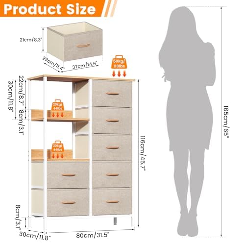 - 【Large-Capacity Layered Storage】This chest of drawers is equipped with 7 fabric drawers and 2 Open shelves, creating a three-dimensional storage space. The drawers allow for organized storage of clothing, miscellaneous items, and other scattered belongings, while the flat top surface serves both as a display area and a functional space for placing table lamps, photo frames, and decorative items. It effectively solves the problems of disorganization and cluttered storage.