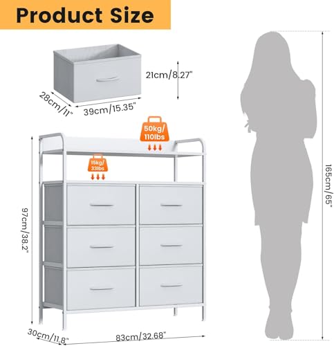 6-Drawer Space-Saving Storage Chest This 6-drawer storage chest (overall 83x30x97 cm, each drawer 39x28x21 cm) offers ample space for clothes, bed linens, cosmetics and odds and ends, turning messy corners tidy instantly. Unlike standard fabric dressers, it features a reinforced double-layer wooden top (supports up to 20 lbs) for displaying decor or folding clothes. Built with a sturdy steel frame, waterproof wooden top and breathable non-woven fabric drawers, it fits bedrooms, living rooms, hallways, nurseries and offices—even doubling as a TV stand. Tool-free plug-in design with full hardware and video guide lets you assemble it in 15 minutes max; maintenance is easy with a damp cloth wipe.