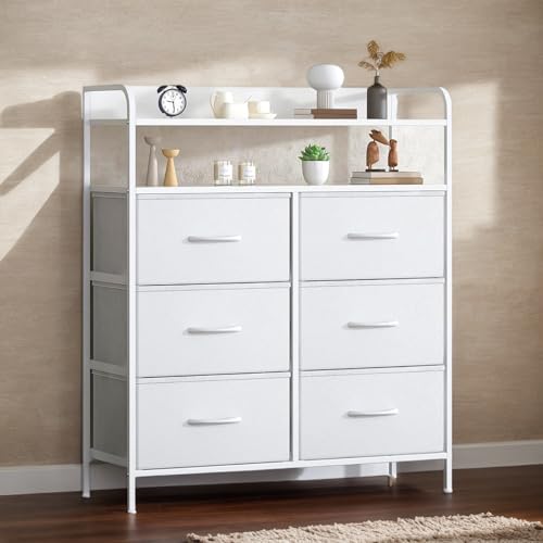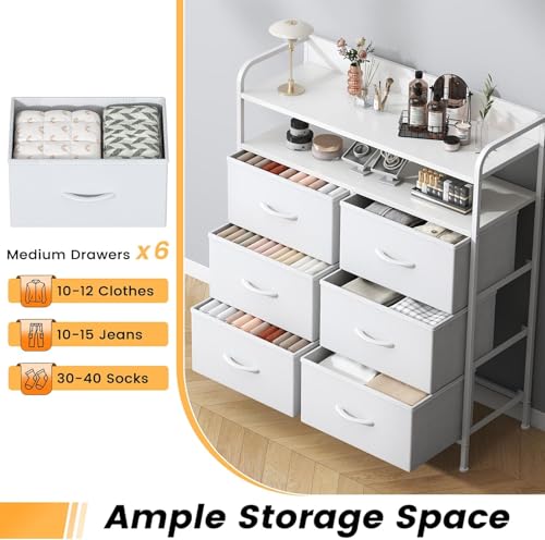 Feonase Chest of Drawers Bedrooms, 6 Drawers Storage Organizer Unit with Metal Frame & Wood Top, Fabric Dresser with Side Pocket, Chest Drawer for Bedroom, Closet, Hallway, Living Room (White)