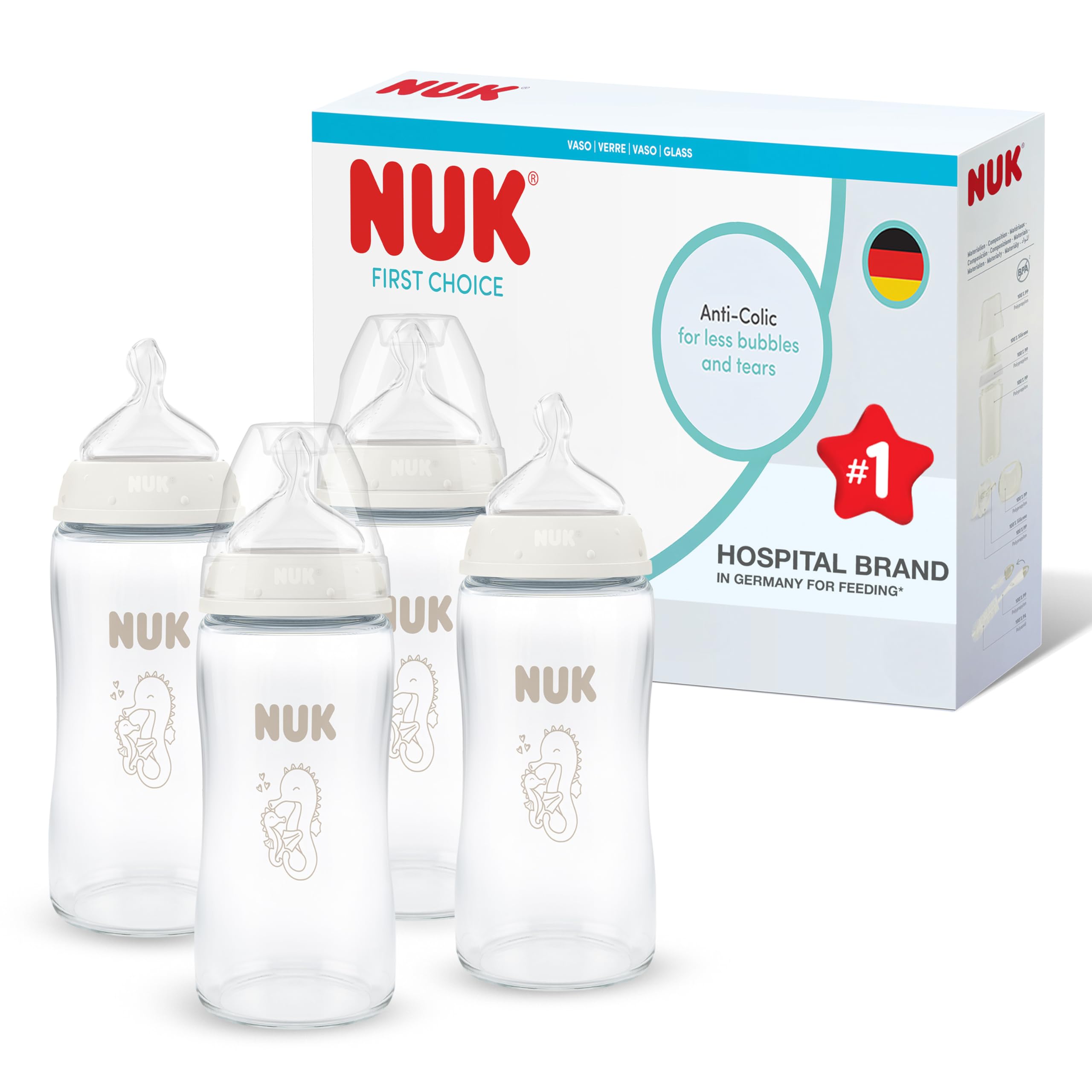 NUK First Choice Baby Bottles | 3+ Months | 240ml | Anti Colic Feeding Bottle | Glass | Temperature Control Indicator | Seahorse | 4 Cou