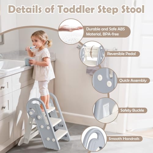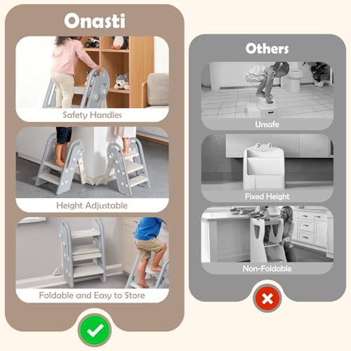 Onasti Foldable Step Stool for Kids, Adjustable 3 Steps for Kid Potty Training with Handles, Learning Tower, Toddler Step Stool for 18 Months to 8 Years, for Kitchen, Bathroom & Bedroom (Grey)