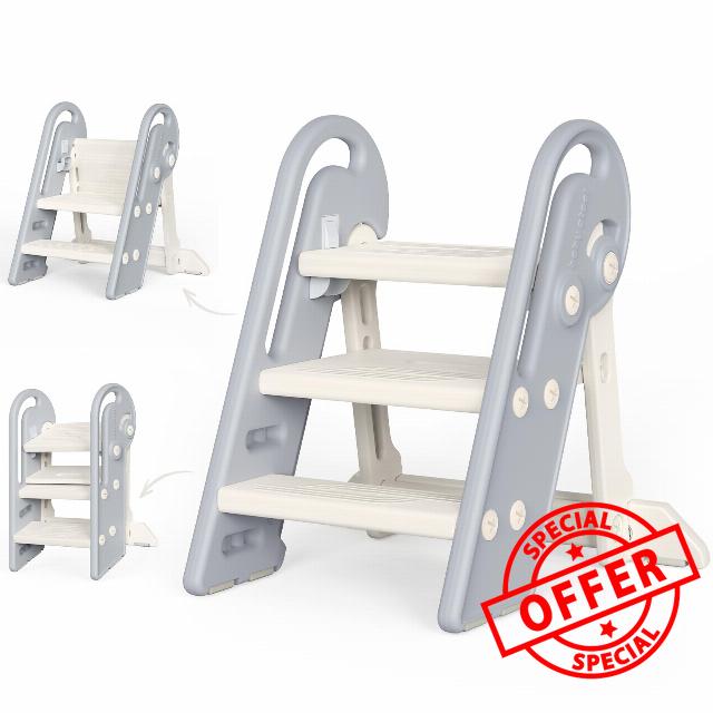 Onasti Foldable Step Stool for Kids, Adjustable 3 Steps for Kid Potty Training with Handles, Learning Tower, Toddler Step Stool for 18 Months to 8 Years, for Kitchen, Bathroom & Bedroom (Grey)