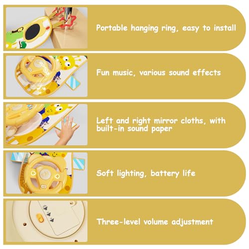 - Multifunctional Entertainment: Equipped with music, lights, and realistic driving sounds, this baby steering wheel toy captivates infants' attention, providing auditory and visual stimulation to reduce fussiness during travel.