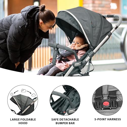 RichBaby Dash Pushchair – One-Hand Fold Compact Stroller, All-Wheel Suspension, Shock-Absorbing Frame, Extendable Hood, Birth to 15kg (3 Years) – Grey