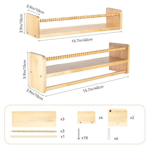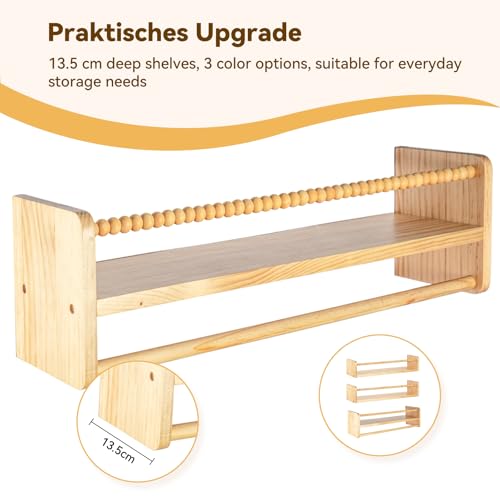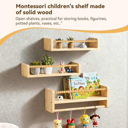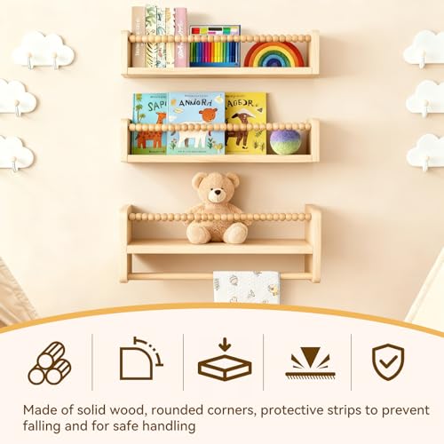 Set of 3 40cm Nursery Shelves Floating Book Shelf for Wall, Solid Wood Kids Bookshelf , Baby Room Wall Decor Organizer for Nursery Bedroom Floating Shelves with Wooden Bead Fence (Pine Wooden)