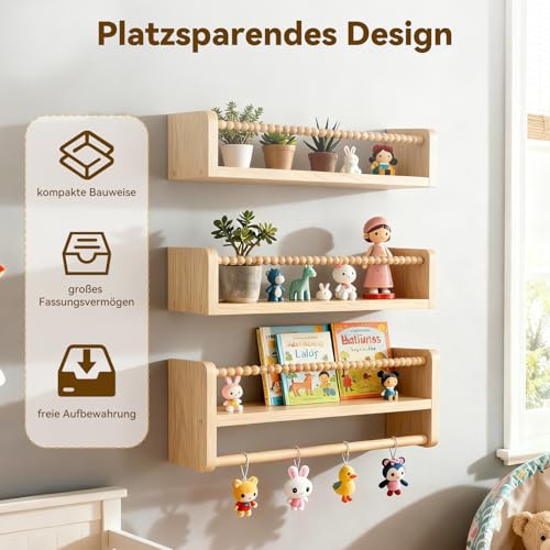 - [ Floating Nursery Bookshelf Design ] Stylish floating nursery shelves designed to display children’s books and toys while saving space. This 3-piece set provides versatile storage for books, dolls, and décor, creating a cozy and organized environment in your baby’s nursery, bedroom, or playroom.