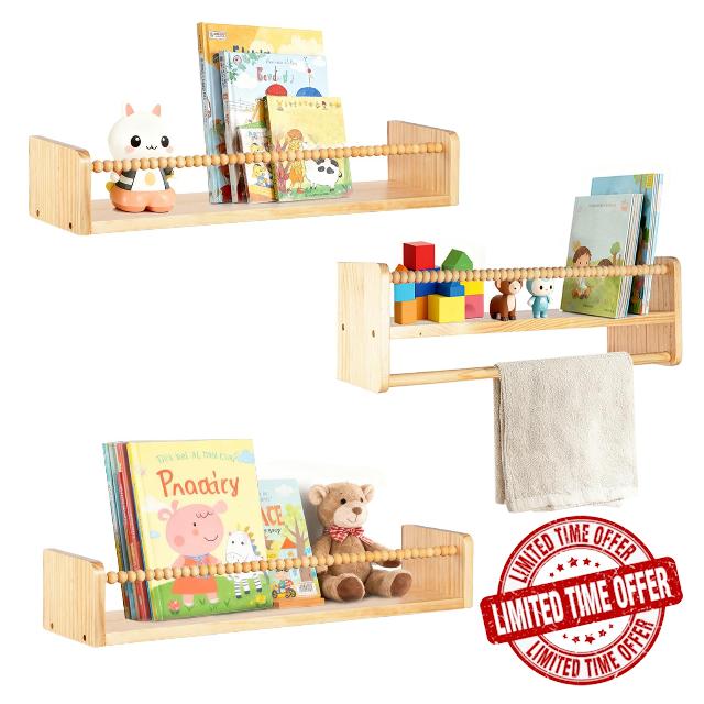 - [ Floating Nursery Bookshelf Design ] Stylish floating nursery shelves designed to display children’s books and toys while saving space. This 3-piece set provides versatile storage for books, dolls, and décor, creating a cozy and organized environment in your baby’s nursery, bedroom, or playroom.
