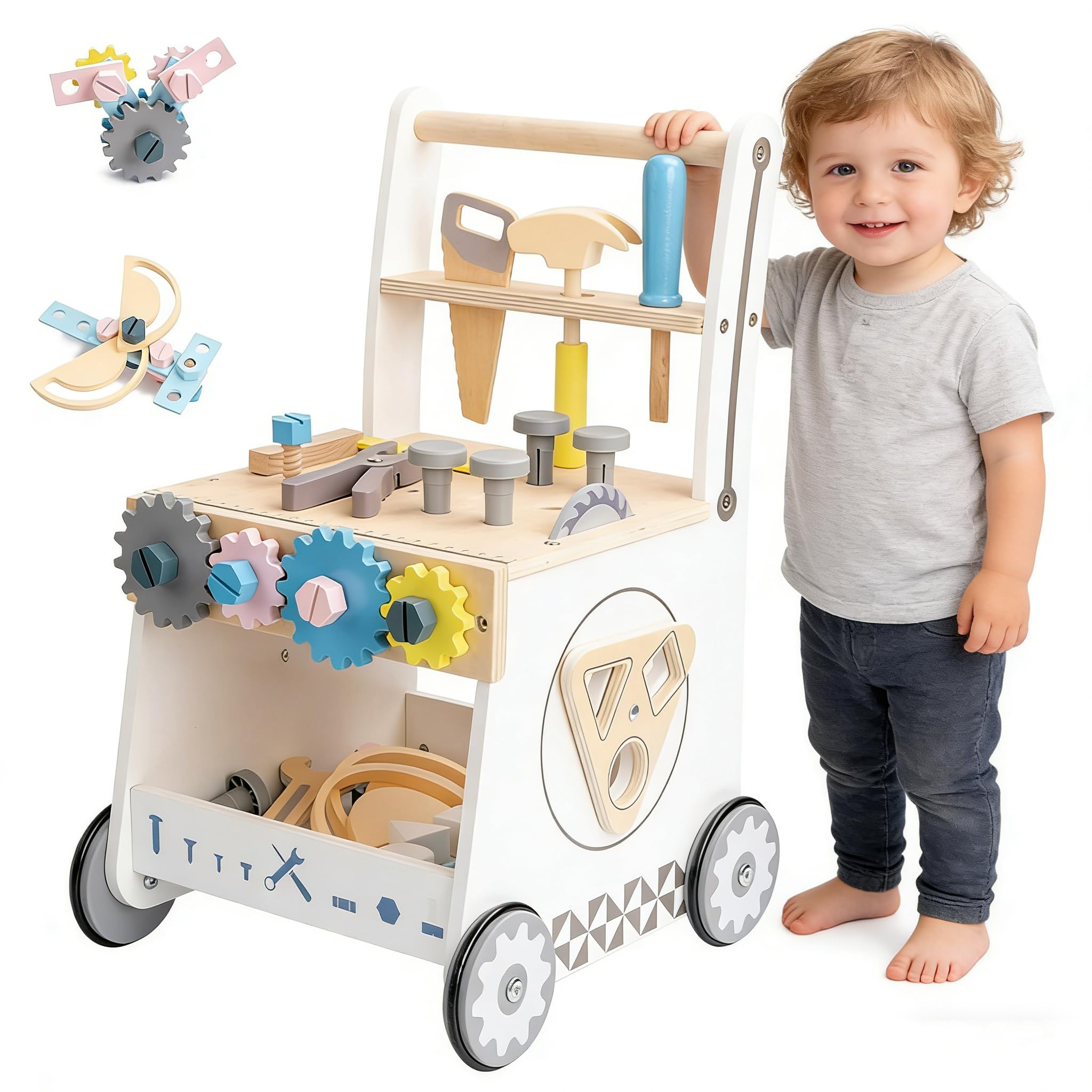 Wooden Baby Walker for Toddlers, 8-in-1 Wooden Pram Toy for 6–12 Months, Baby Activity Centre Walker with Shape Sorter, Toy Tool Set Workbench and Clock Perception, Gifts for Boys Girls