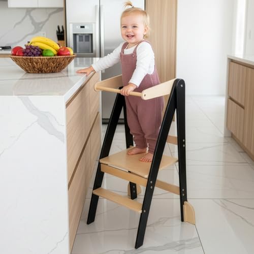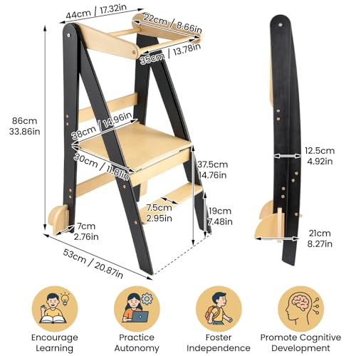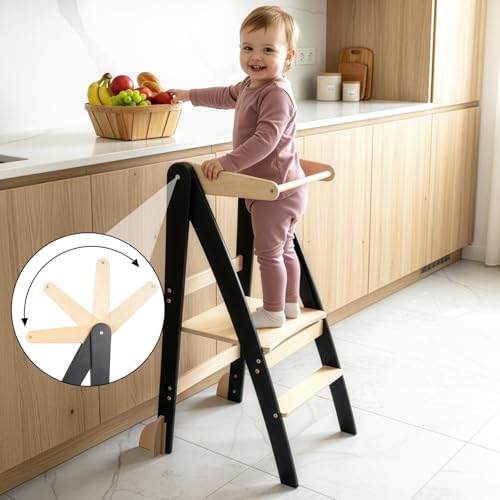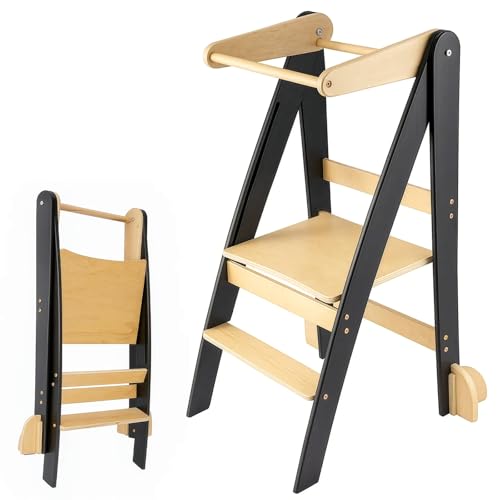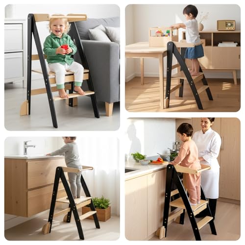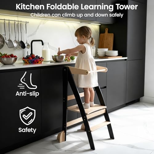 Wooden Learning Tower for Toddlers, Foldable Kids Step Stool with Anti-Tip Safety, Space-Saving Helper Tower for Kitchen & Bathroom Learning Activities (Black)