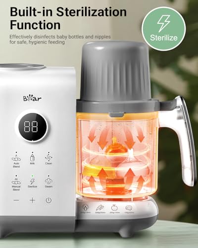 - – – : Say goodbye to kitchen clutter! The Bear baby food blender does it all in one compact device—steam, blend, sterili-ze bottles and warm milk. Simplify your daily routine and create fresh, homemade meals for your little one without the need for extra appliances
