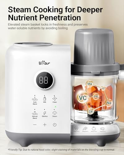 - . – – : Prepare up to five servings at once(for babies 6-8 months)—perfect for batch cooking and busy parents. Bear baby food maker steamer comes with innovative large capacity two-layer steam baskets which uses gentle 360° steam circulation to preserve essential vitamins and minerals, avoiding nutrient loss from boiling. Cook multiple ingredients at once or keep flavors separate—saving you time while ensuring delicious, nutrient-rich meals for your baby