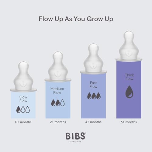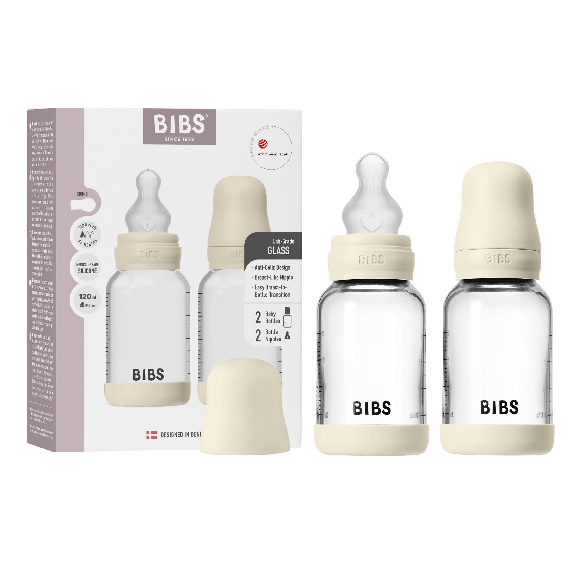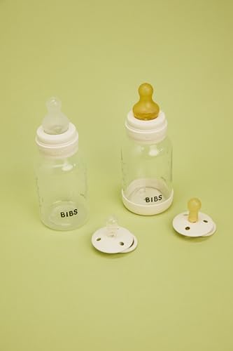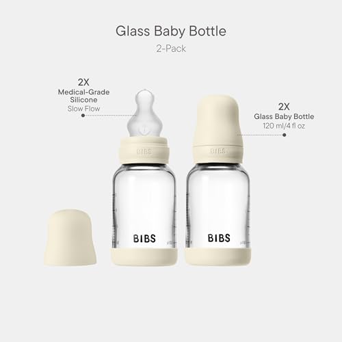 BIBS Baby Glass Bottle 2-Pack 120ml. Anti-Colic. Vented Round Silicone Nipple. Supports Natural Breastfeeding, Complete Set – 120 ml (Pack of 2), Ivory