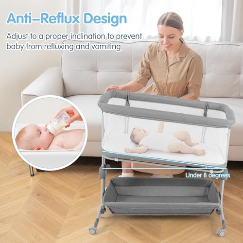 - 【6-Level Adjustable Height】This baby bassinet with 6 adjustable heights(77-87cm) can accommodate most parents’ beds, providing convenient access to your baby for nighttime feedings and more. You can adjust it to a proper inclination to prevent baby from refluxing and vomiting (tilt angle: under 8 degrees).