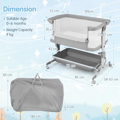 COSTWAY Baby Bedside Crib, 6-Level Heights Adjustable Bassinet with Mattress, Storage Shelf, Lockable Wheels, Carry Bag, Newborn Bedside Sleeper for Birth to 9kg (Grey)