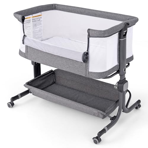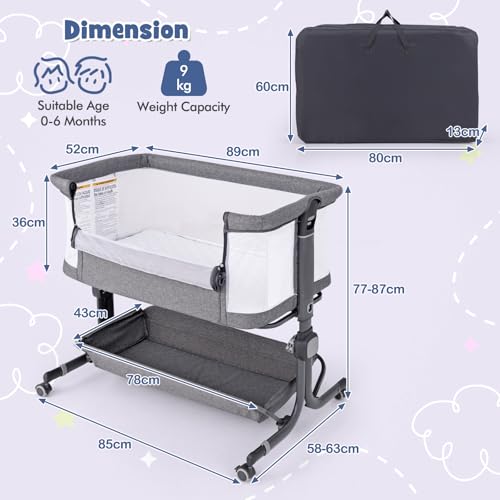 COSTWAY Baby Bedside Crib, 6-Level Heights Adjustable Bassinet with Mattress, Storage Shelf, Lockable Wheels, Carry Bag, Newborn Bedside Sleeper for Birth to 9kg (Dark Grey)