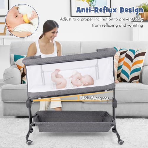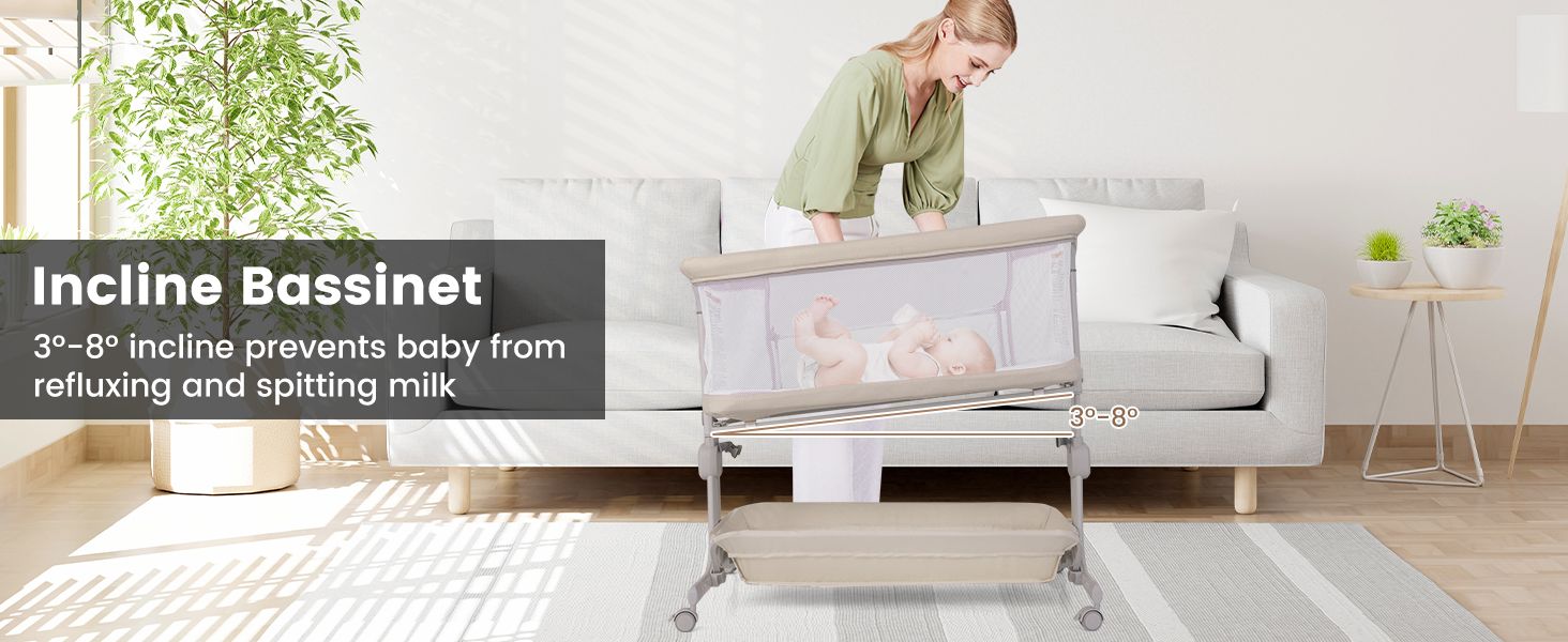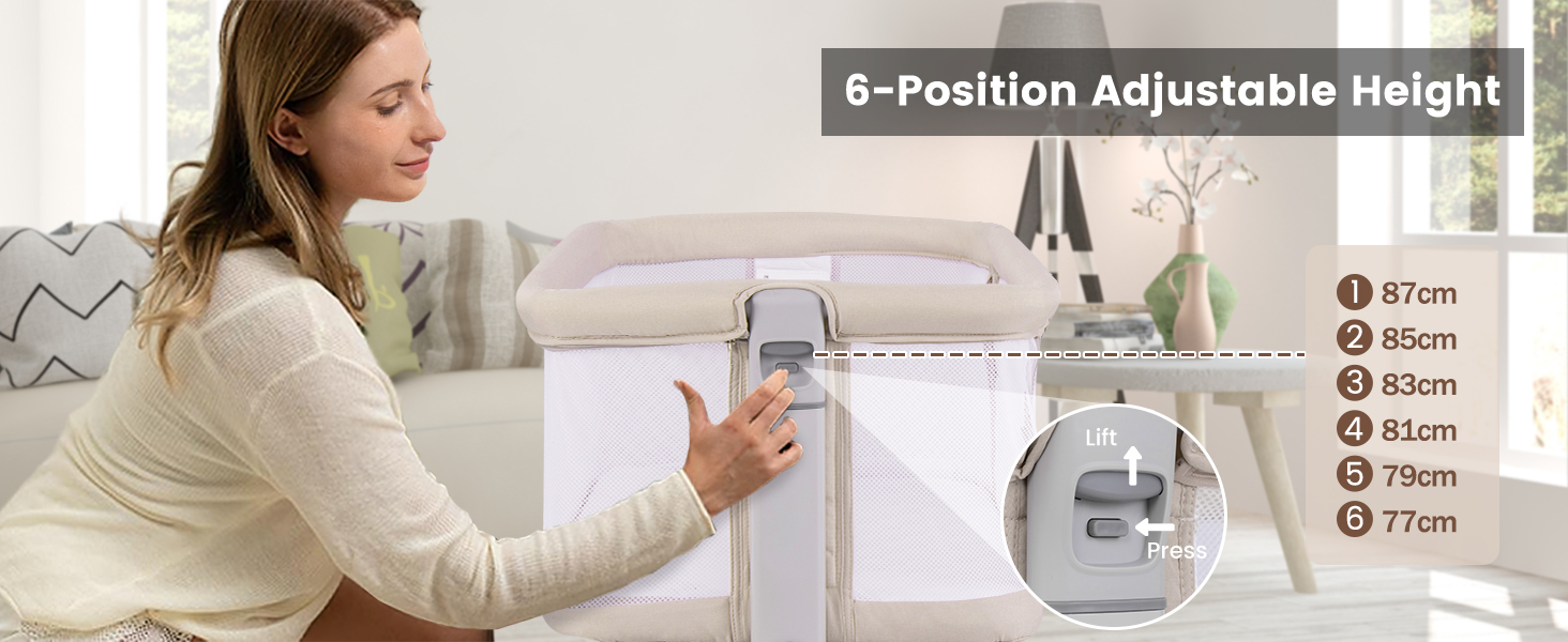 - 【6-Level Adjustable Height】This baby bassinet with 6 adjustable heights(77-87cm) can accommodate most parents’ beds, providing convenient access to your baby for nighttime feedings and more. You can adjust it to a proper inclination to prevent baby from refluxing and vomiting (tilt angle: under 8 degrees).