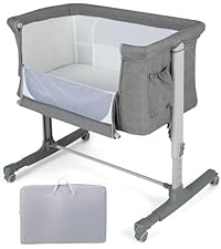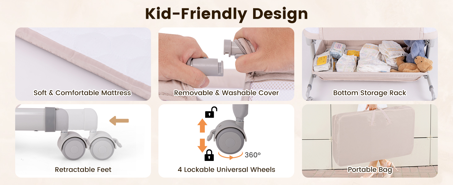 - 【Foldable & Portable for Easy Use】The folding design allows for easy storage and transportation, making it ideal for travel or visits. A carry bag is included for effortless portability and storage convenience. With 4 lockable universal wheels, this bedside crib is easy to move between rooms.