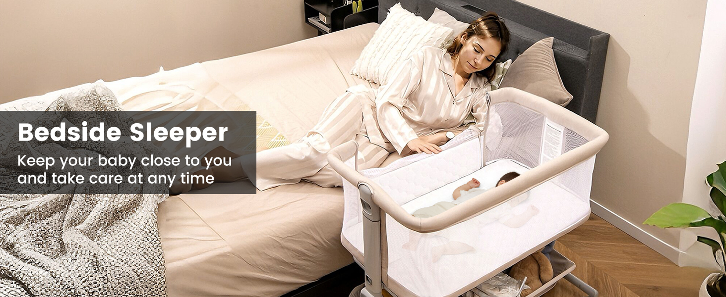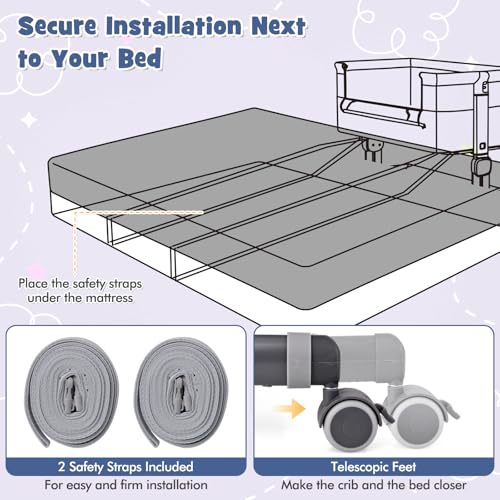 - 【Secure Installation Next to Your Bed】The 2 included safety straps allow for easy and firm installation while the telescoping feet make the crib and the bed closer. Moreover, the breathable and see-through mesh on all sides offers peace of mind that your baby is always close by and safe during co-sleeping.