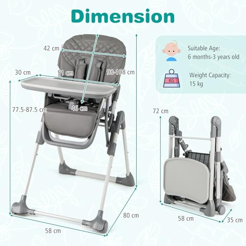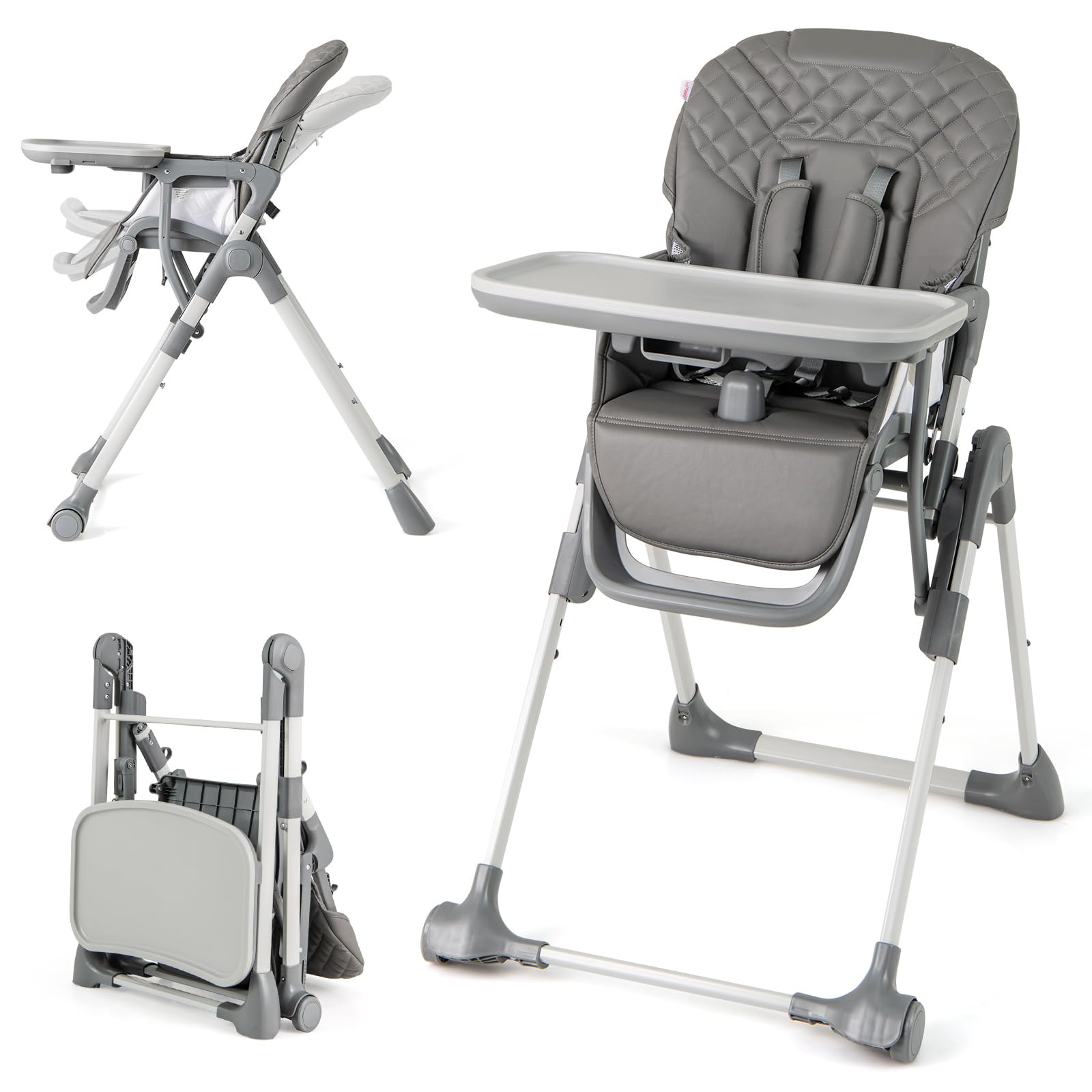 COSTWAY Foldable High Chairs for Babies and Toddlers, Adjustable Highchair with Footrest, Detachable Tray, Safety Harness, for 6 Months to 3 Years (Grey)