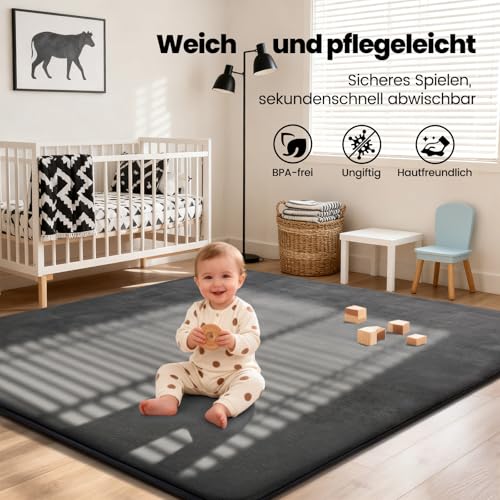 Crawling Mat Baby 150 x 180 cm, 3 cm Thick Foam Play Mat, Ultra Soft Support Plush Feel Carpet Children's Room Easy Care Crawling Blanket Baby with Non-Slip Underside, Dark Grey