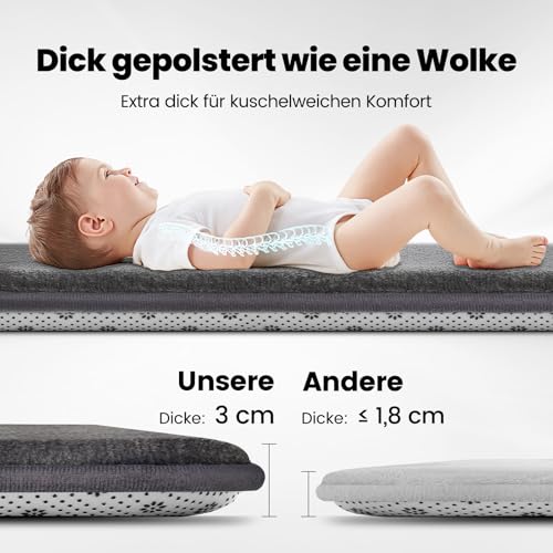 - Extra thick foam play mat: Our extra thick foam crawling mat is made of 3 cm thick memory foam and provides your baby with stable yet soft support when playing, crawling and in the prone position. The surface is made of ultra-soft flannel and feels particularly comfortable on the skin. This crawling blanket offers your baby a soft and safe play area and invites them to carefree, unlimited fun.