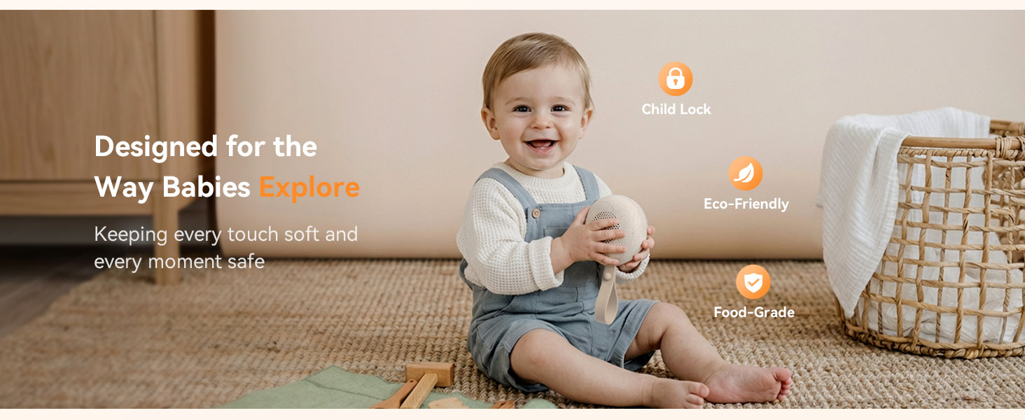 - : Made with recycled, food-grade materials, this white noise machine baby is safe for little hands to touch, hold and explore. Designed for babies who naturally grab and mouth objects, it supports early curiosity while giving parents confidence in everyday use—at home or on a playmat.
