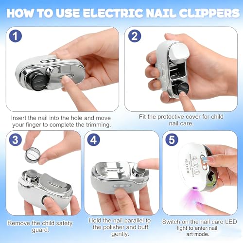 - 【A Thoughtful & Practical Gift for Everyone】This electric nail clippers with led light features safety protection blades and a smooth, curved cutting groove design. Intelligent sensor detection automatically stops the blade when foreign objects are detected, ensuring safety and energy efficiency. Beautifully packaged, it's an ideal gift for birthdays, holidays, or anyone who values smart personal care.
