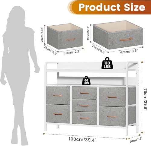 Feonase Chest of Drawers Bedroom, Fabric Dresser with 7 Drawers, Storage Dresser with 2 Layer Shelves, Tall Storage Organizer Unit with Steel Frame, for Bedroom, Living Room, Hallway, Light Gray