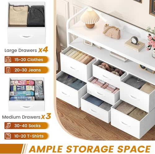 Feonase Chest of Drawers Bedroom, Fabric Dresser with 7 Drawers, Storage Dresser with 2 Layer Shelves, Tall Storage Organizer Unit with Steel Frame, for Bedroom, Living Room, Hallway, White